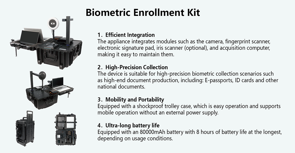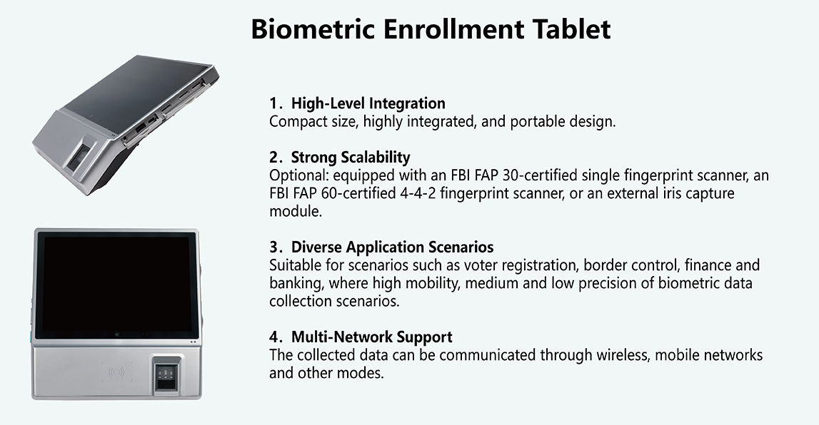 NJA provides two kinds of professional biometric enrollment solutions for clients: the Biomet•ric Enrollment Tablet and the Biometric Enrollment Kit. The Biometric E€nrollment Device is suitable for identity document information acquisition, voter registration, border control, financial services, banking, and other high-mobility application fields. They provide users with comprehensive and efficient biomet€ric data acquisition solutions.